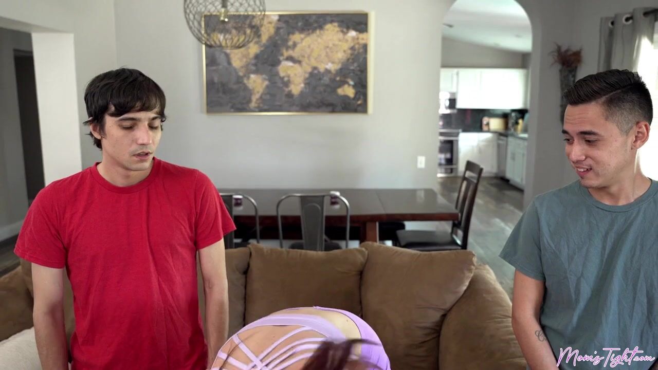 Ricky Spanish and Juan Loco are playing video games when Ricky's stepmom, Artemisia Love tries to tell them to get off the couch. She tells them they need to work out or they'll never be able to please their future wives. When the boys ignore her, she flounces off into her bedroom to change into some appropriate workout clothes that highlight her curves and give her some serious camel toe. Grabbing a whistle, Artemisia blows it to get the boys' attention and orders them off the couch.In their surprise, Ricky and Juan do as they are told. She begins by demonstrating some stretches to do before exercising, which just shows off her body even better. When Artemisia realizes that both boys have boners, she suggests that both boys fuck her since working out makes her hot as hell and she wants to show off how tight her pussy is. She gets down on her knees between the boys so she can demonstrate that she knows just how to handle two dicks at once by blowing and stroking.Getting on her knees, Artemisia gives her full attention to Juan in a deep throat BJ as Ricky eats her out and then fucks her in doggy. Juan gets to experience the tightness of Artemisia's velvet glove when she rides his hardon while blowing Ricky. Ricky gets to enjoy Artemisia on her back as he gives it to his bigtit milfy stepmom whose mouth is busy on Juan's cock. Juan is the first to cum, blowing his load on those lovely boobies. A moment later, Ricky pulls out for his own cum shot across Artemisia's belly. She tells the boys if they quit with the video games maybe they can all do this again.